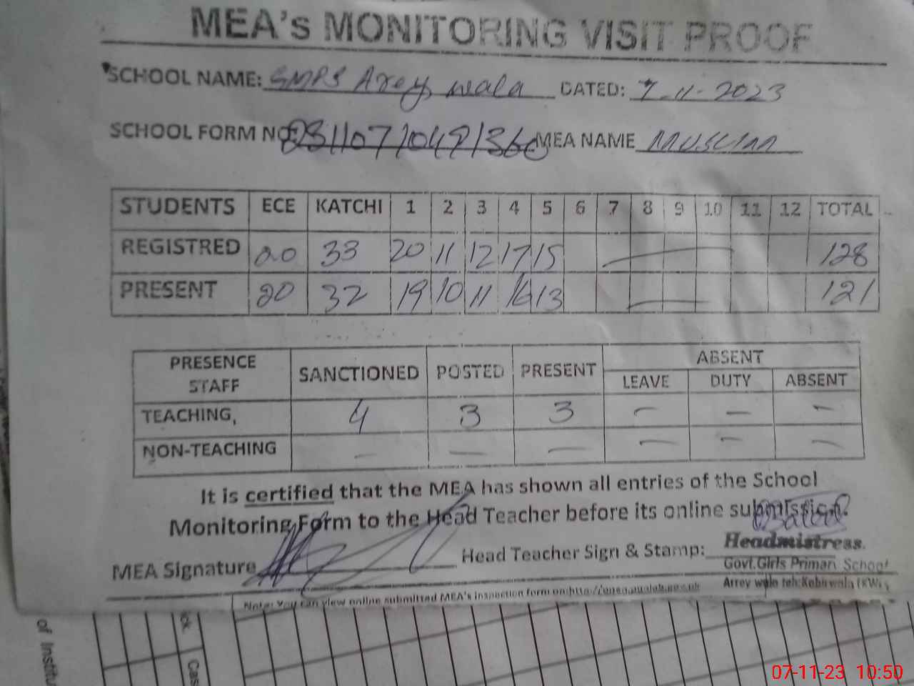 | Attendance Register | Head Teacher | MEA with School | Visit Proof |