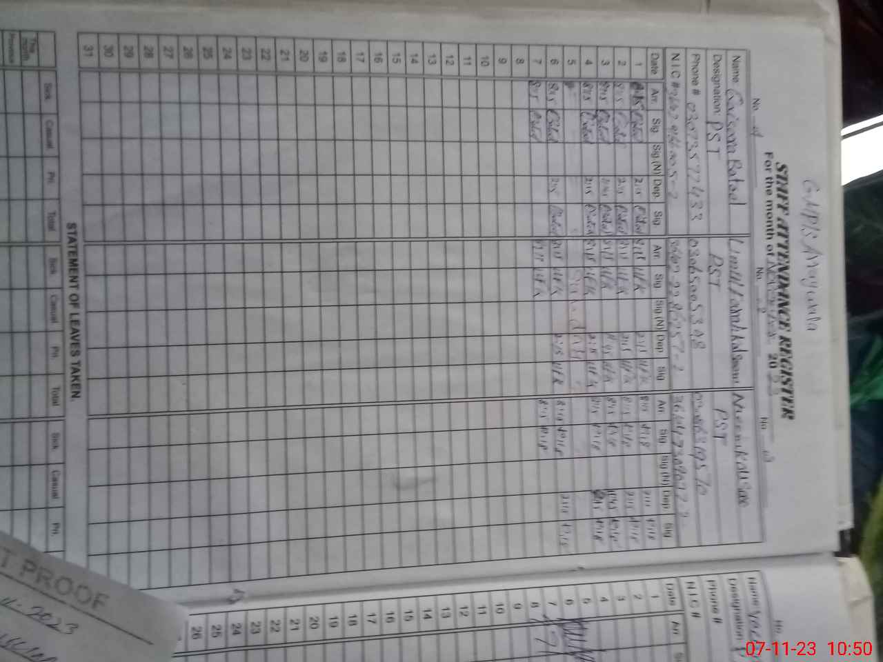 | CNIC | Full Name | Designation | R/C | Absence During Last Calender Month |