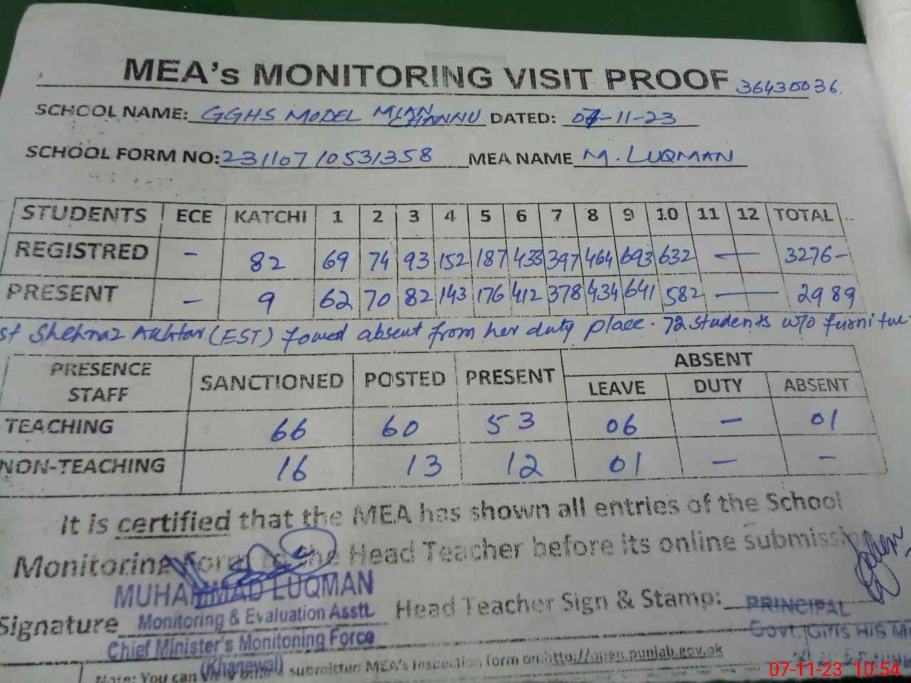 | Monitoring Date: 07-11-2023 | Start Time: 07-11-2023 09:46 AM | End Time: 07-11-2023 10:57 AM | Name of MEA: Mu**** Lu**** | |