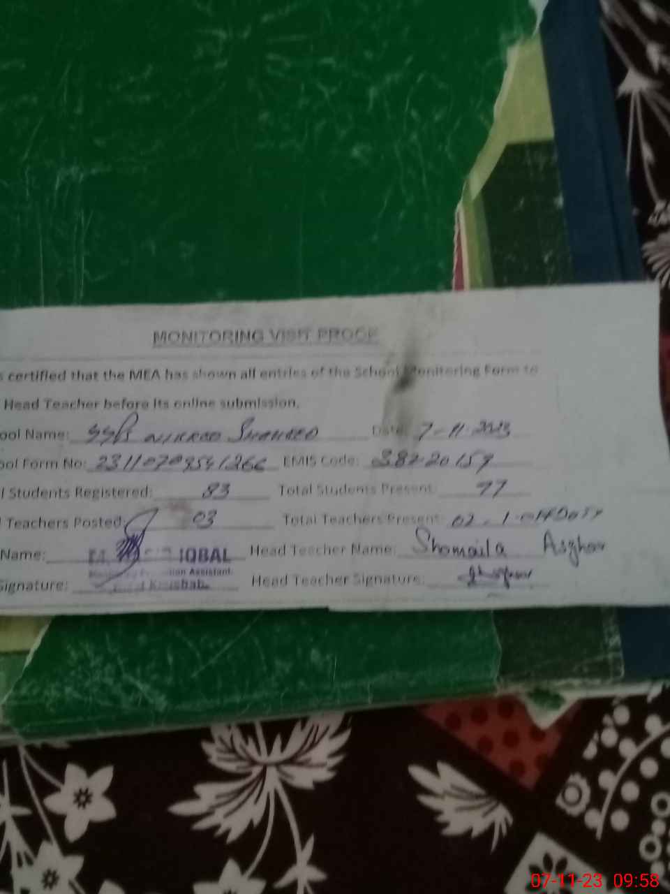 | Attendance Register | Head Teacher | MEA with School | Visit Proof |