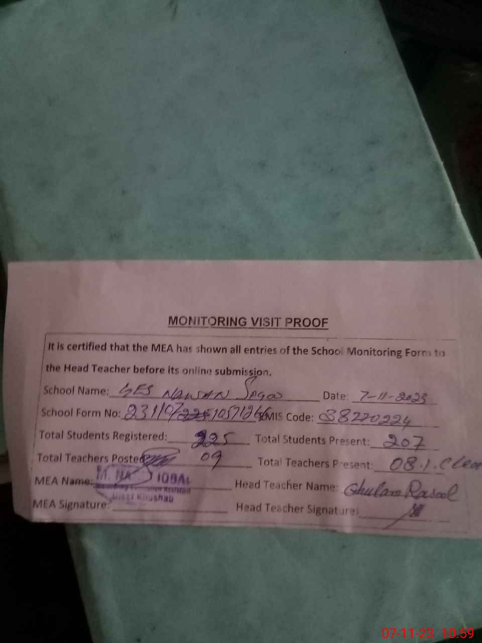 | Attendance Register | Head Teacher | MEA with School | Visit Proof |