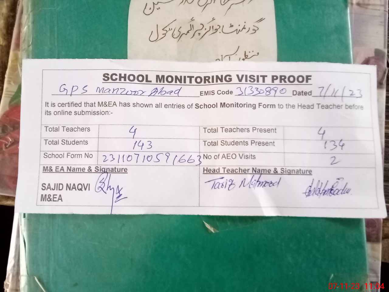| Attendance Register | Head Teacher | MEA with School | Visit Proof |