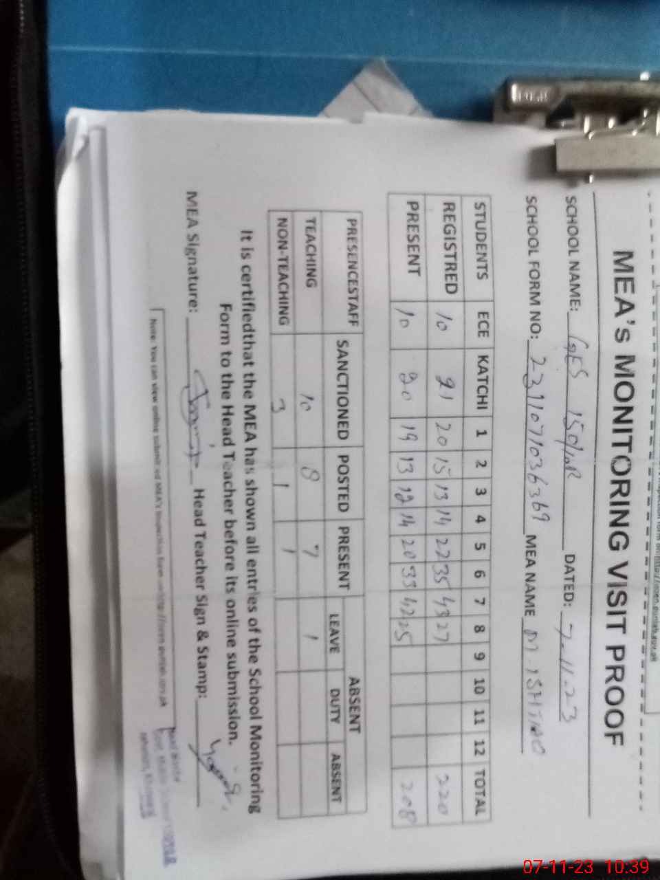 | Attendance Register | Head Teacher | MEA with School | Visit Proof |