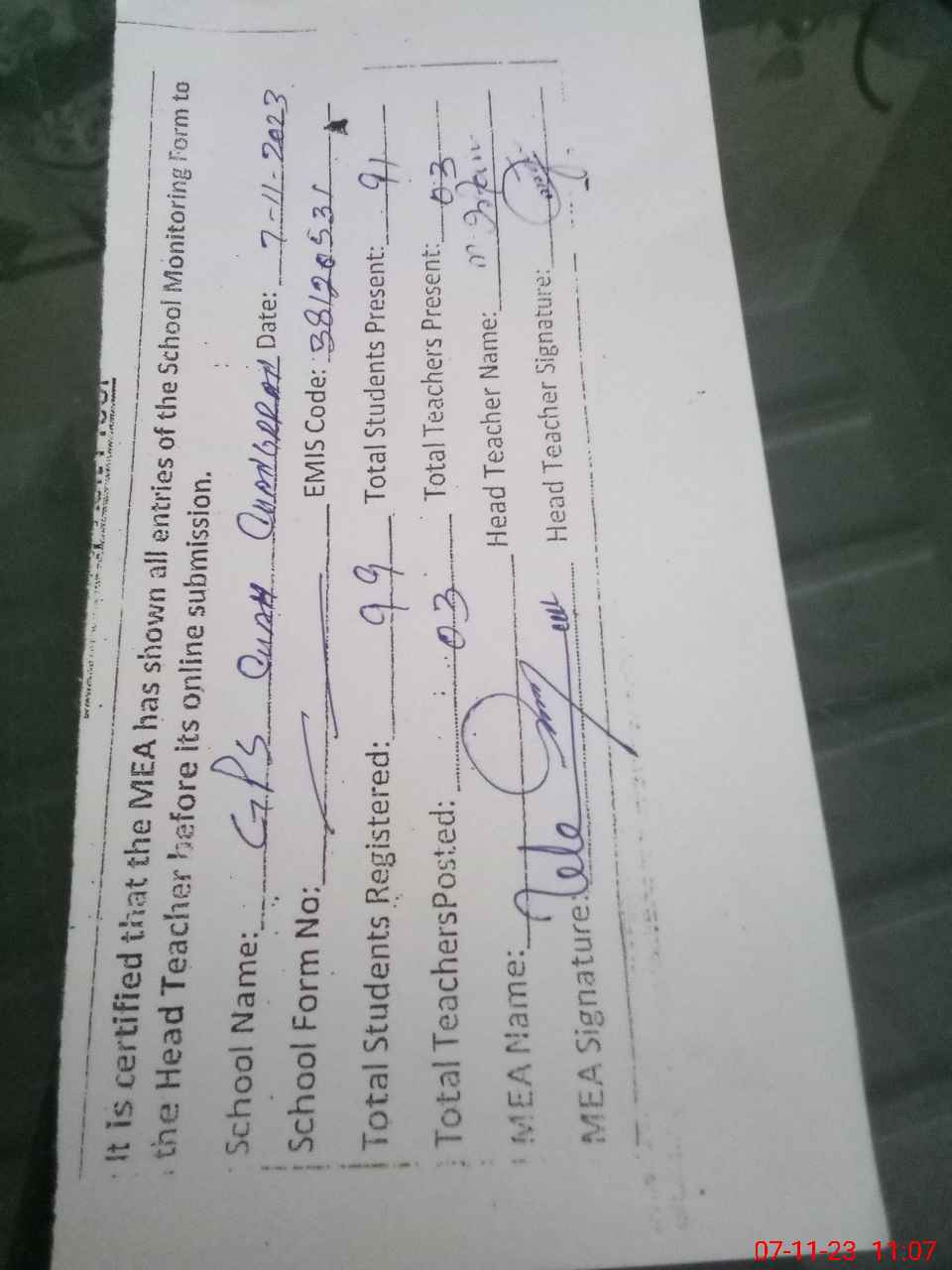 | Attendance Register | Head Teacher | MEA with School | Visit Proof |