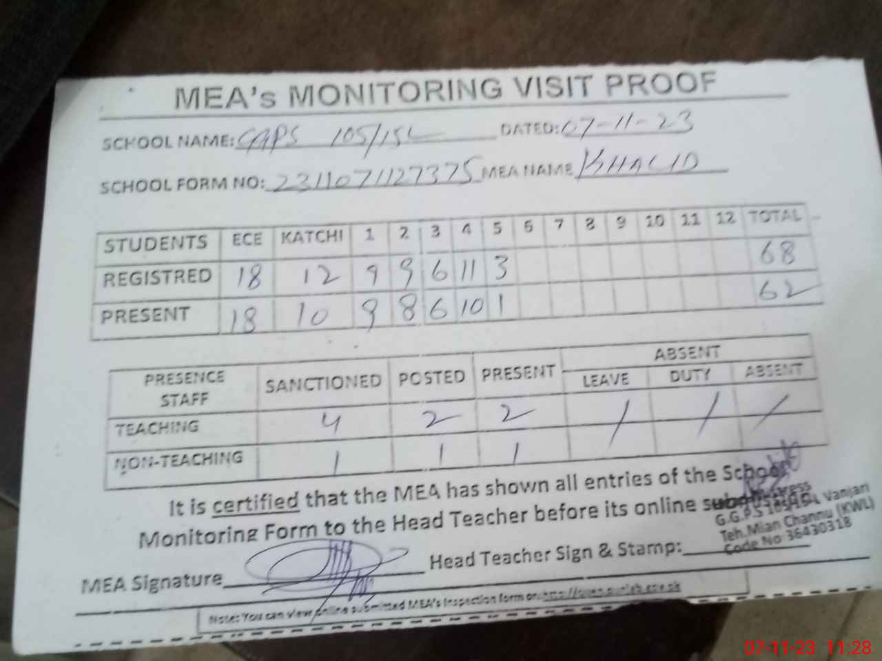 | EMIS Code: 36430318 | Name of School: GGPS 105/15-L, MIAN CHANNU | |||
