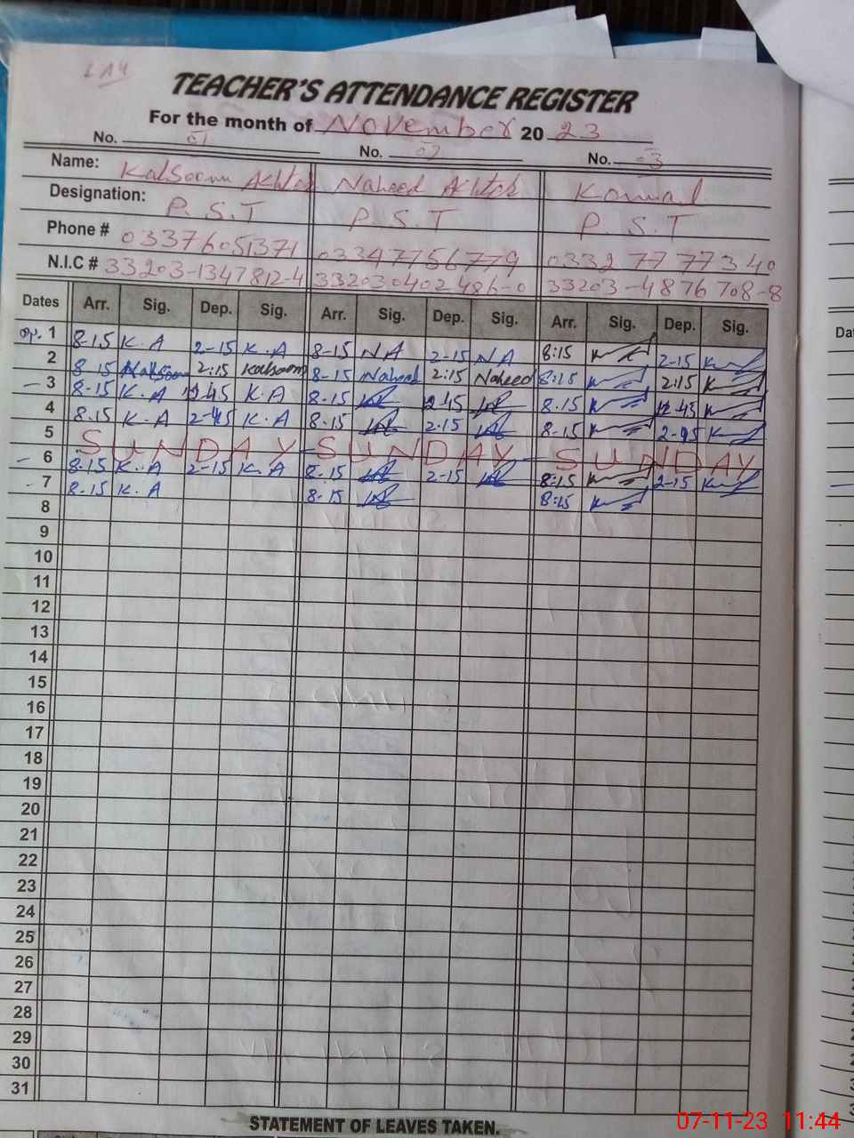 | CNIC | Full Name | Designation | R/C | Absence During Last Calender Month |