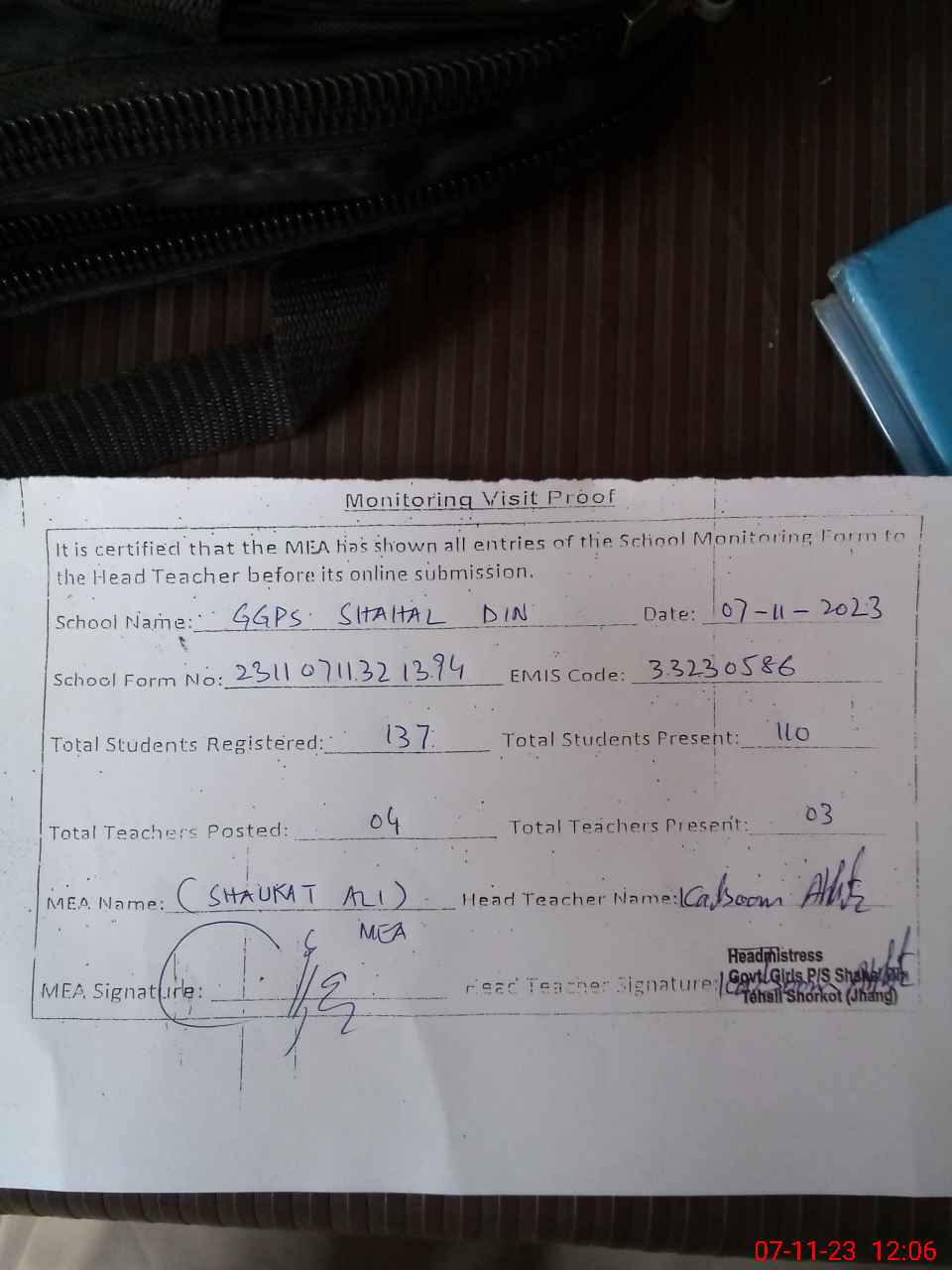| Attendance Register | Head Teacher | MEA with School | Visit Proof |