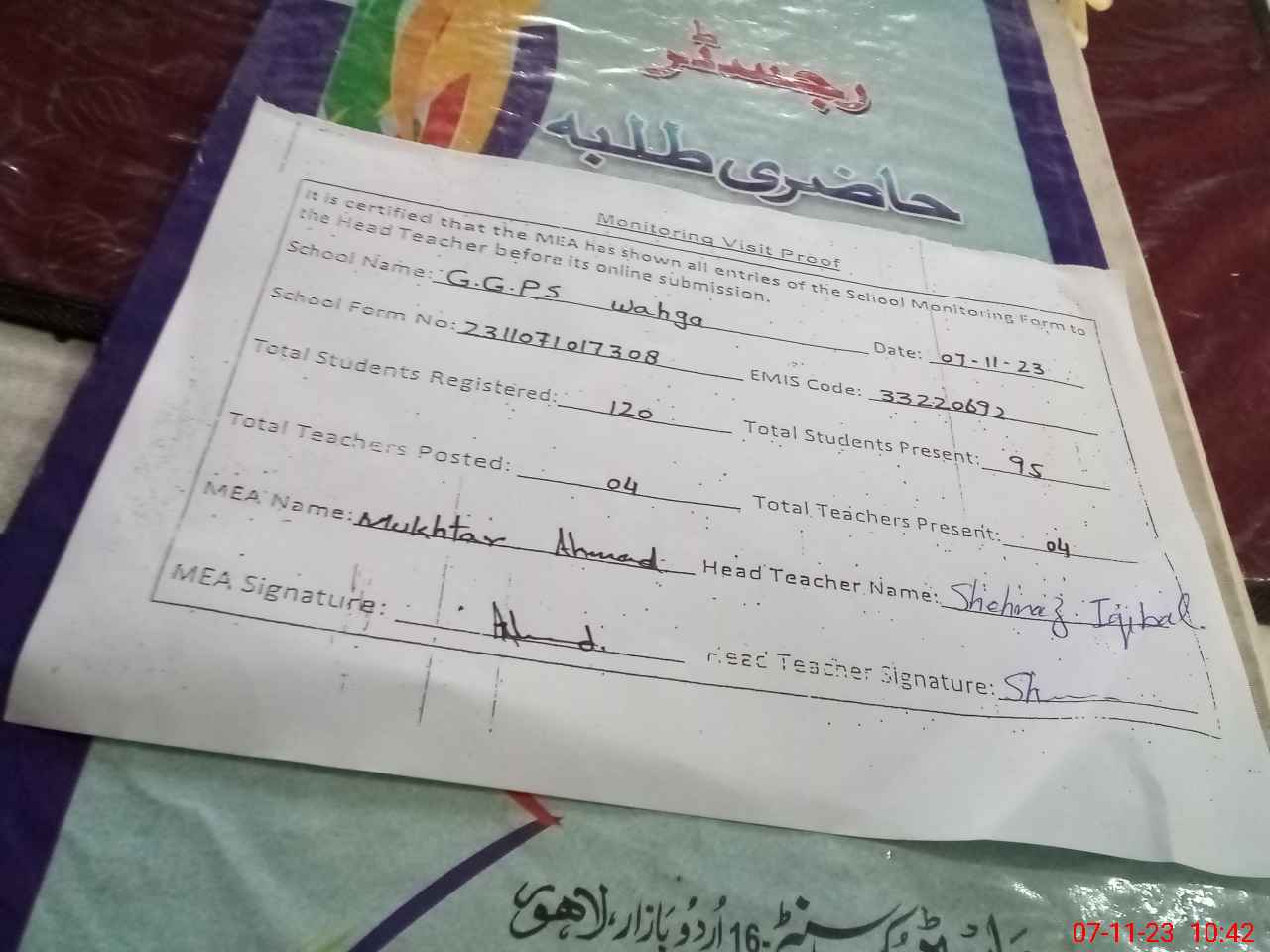 | Attendance Register | Head Teacher | MEA with School | Visit Proof |