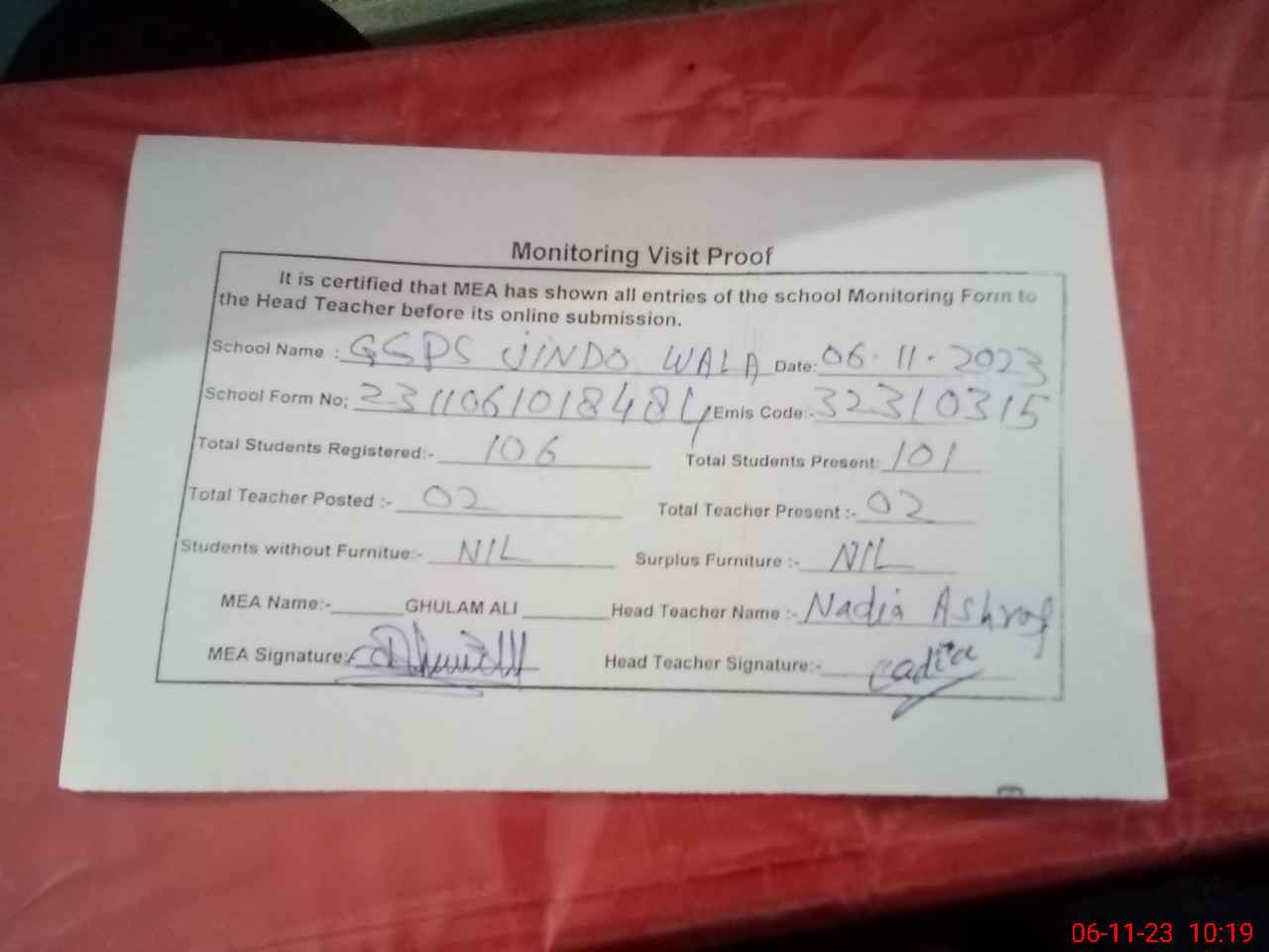 | Monitoring Date: 06-11-2023 | Start Time: 06-11-2023 09:51 AM | End Time: 06-11-2023 10:20 AM | Name of MEA: Gh**** Al**** | |
