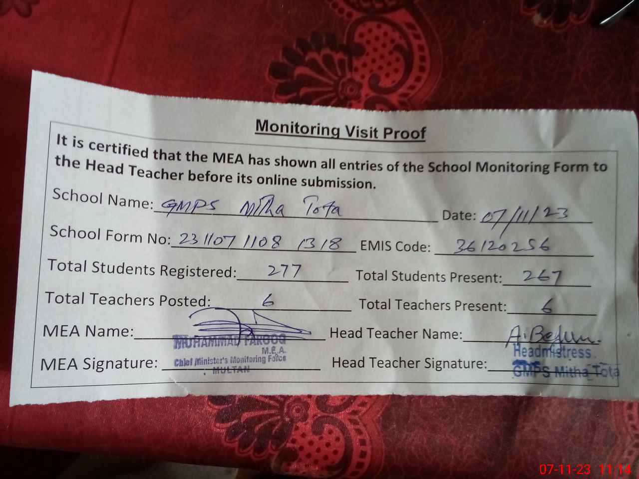 | Attendance Register | Head Teacher | MEA with School | Visit Proof |