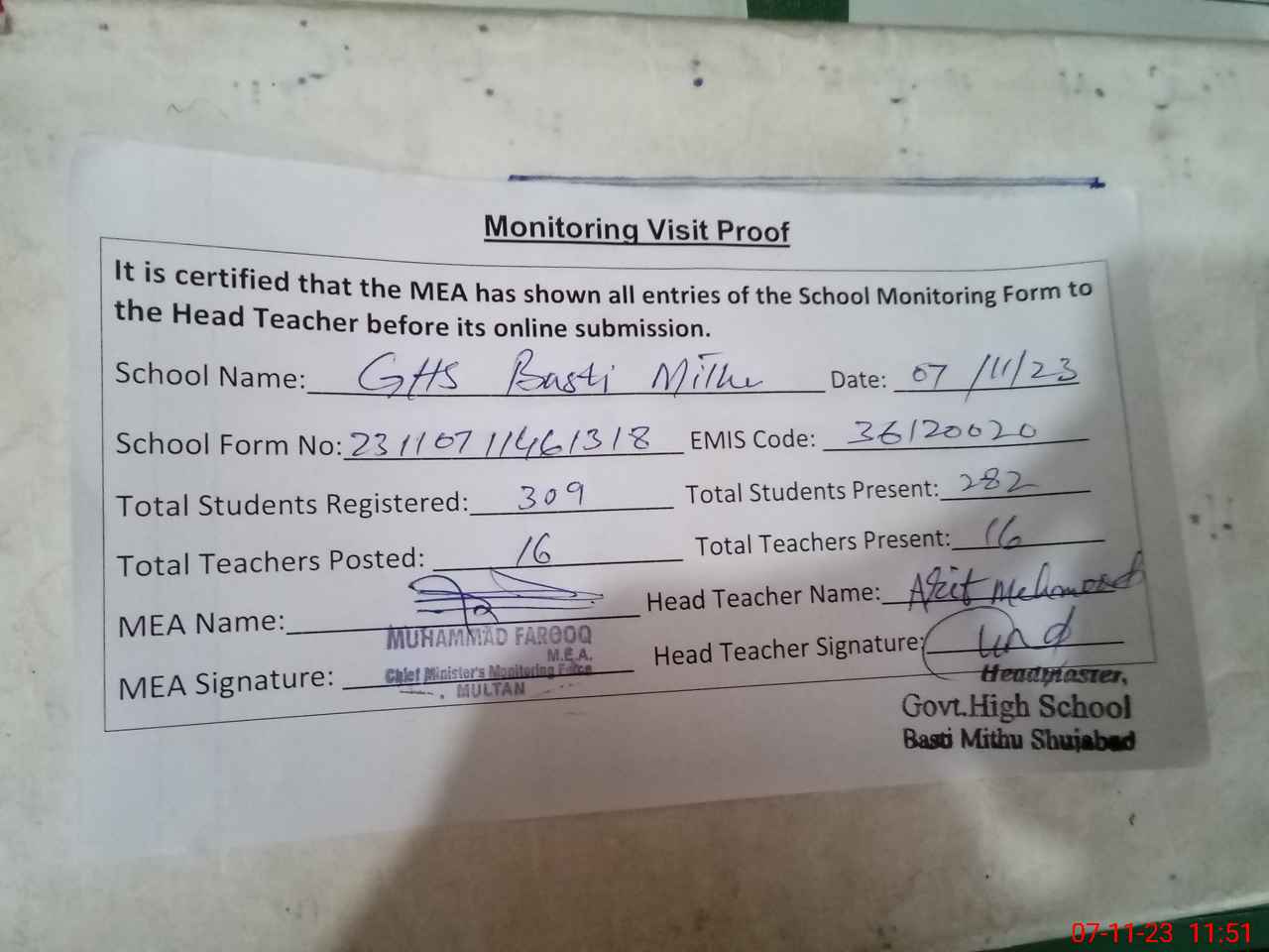 | Attendance Register | Head Teacher | MEA with School | Visit Proof |