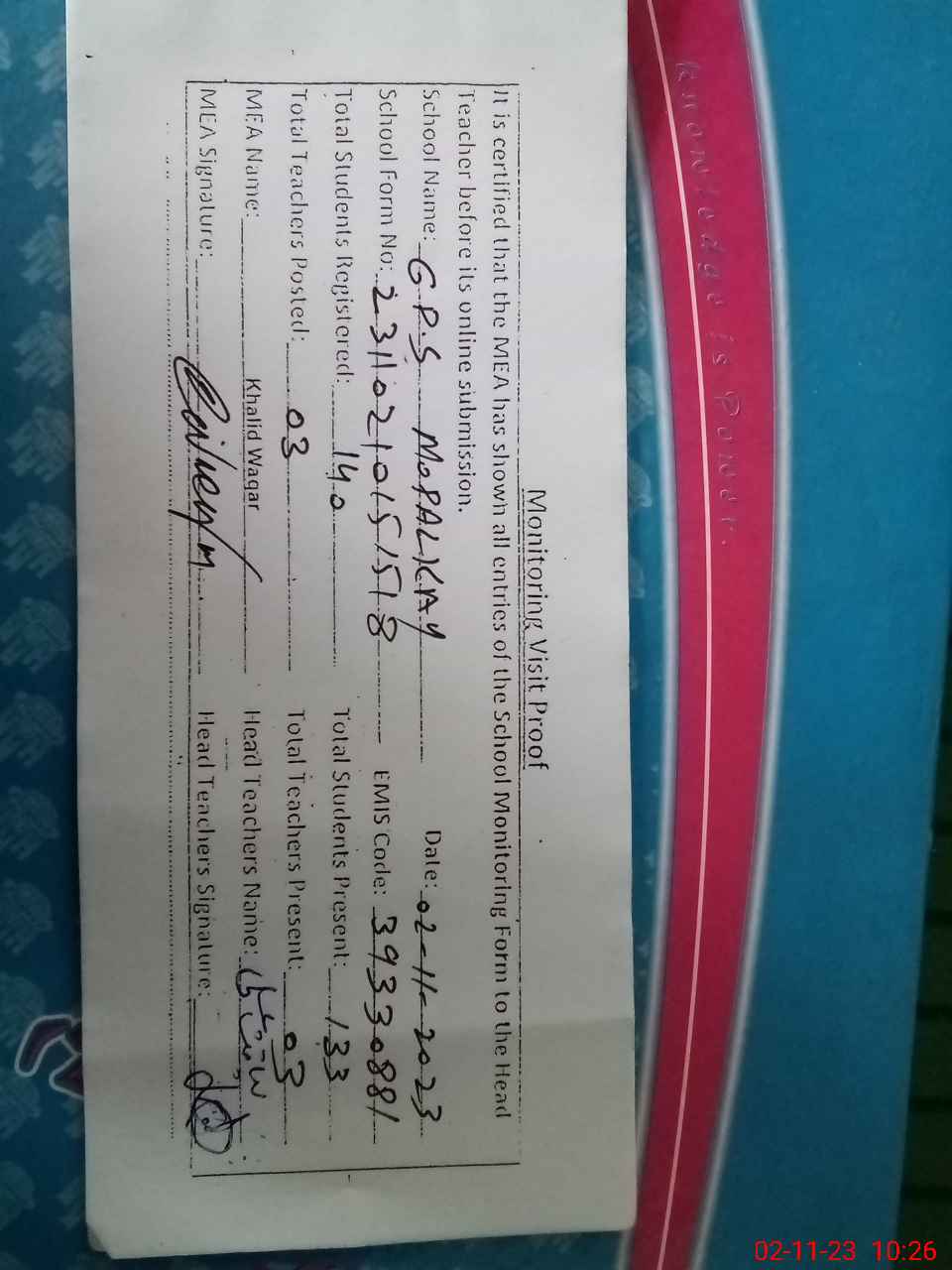 | Attendance Register | Head Teacher | MEA with School | Visit Proof |