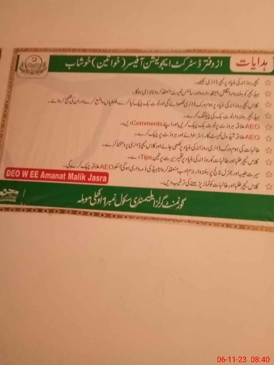 | District: KHUSHAB | Tehsil: QUAIDABAD | Markaz: CHAK NO 22/MB (FEMALE) | Level: Middle | |