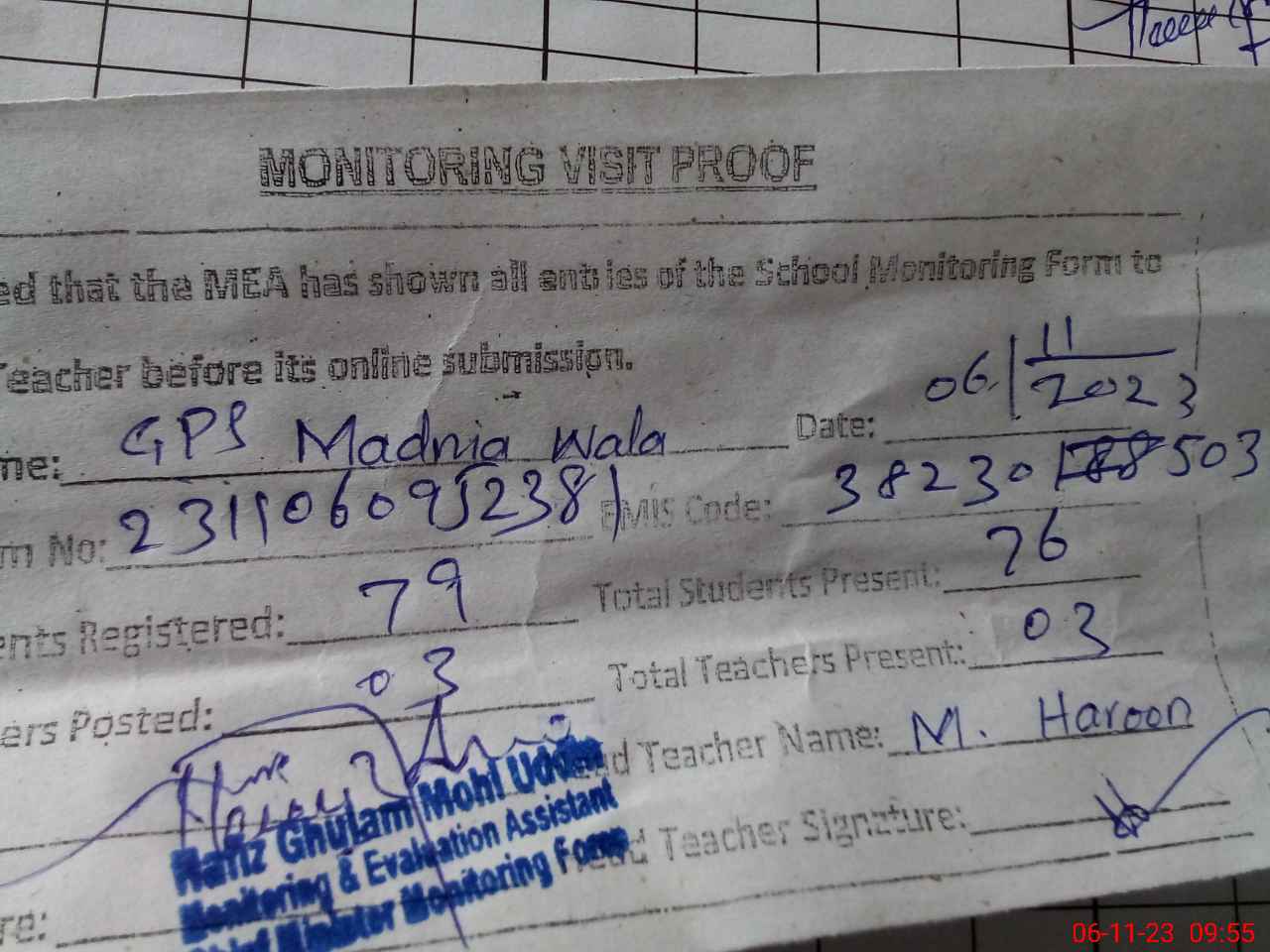 | Attendance Register | Head Teacher | MEA with School | Visit Proof |