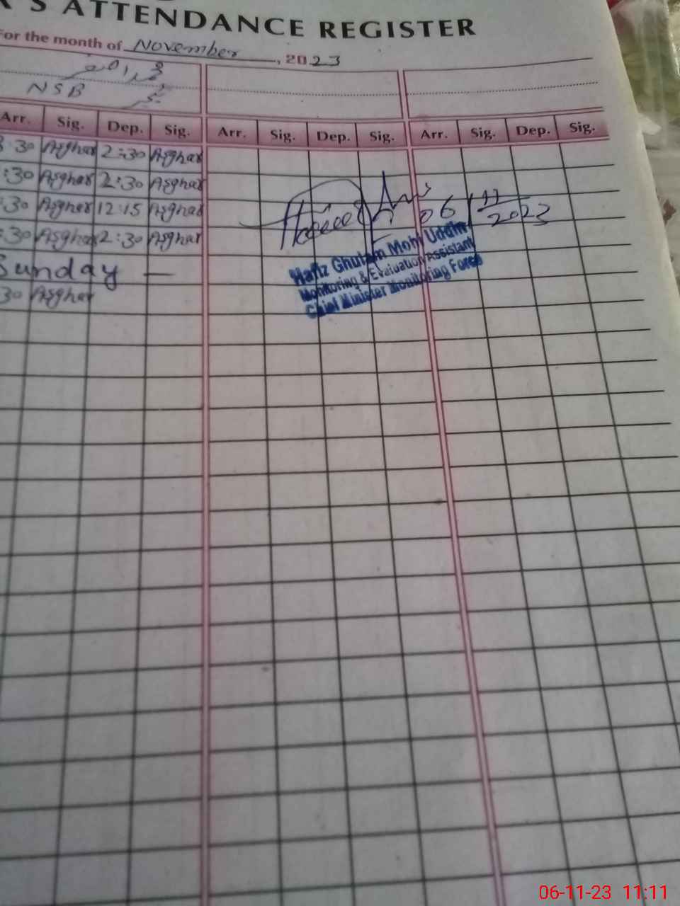 | Monitoring Date: 06-11-2023 | Start Time: 06-11-2023 10:55 AM | End Time: 06-11-2023 11:15 AM | Name of MEA: HA**** GH**** MO**** UDDI**** | |