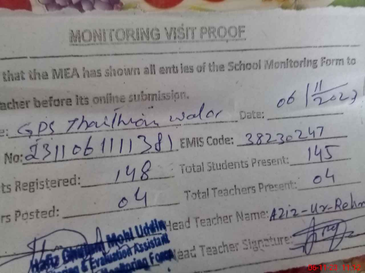 | Attendance Register | Head Teacher | MEA with School | Visit Proof |