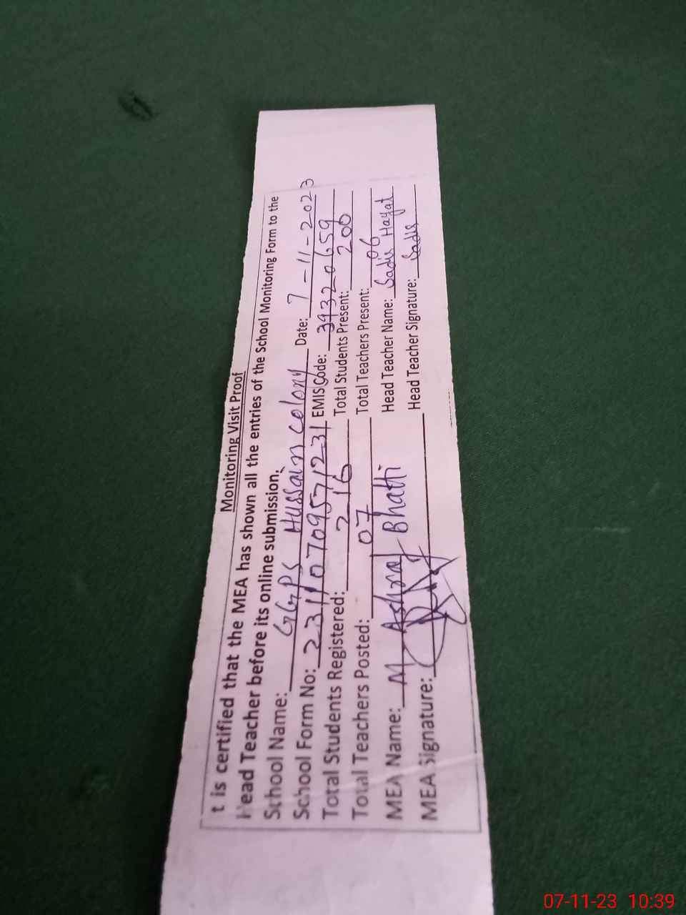 | Certified that this School was Inspected by the Undersigned MEA/DMO Today and the Information Stated Above is as Per Record. | |||||
