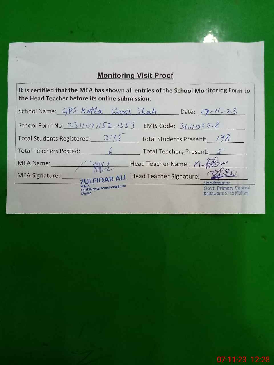 | Attendance Register | Head Teacher | MEA with School | Visit Proof |