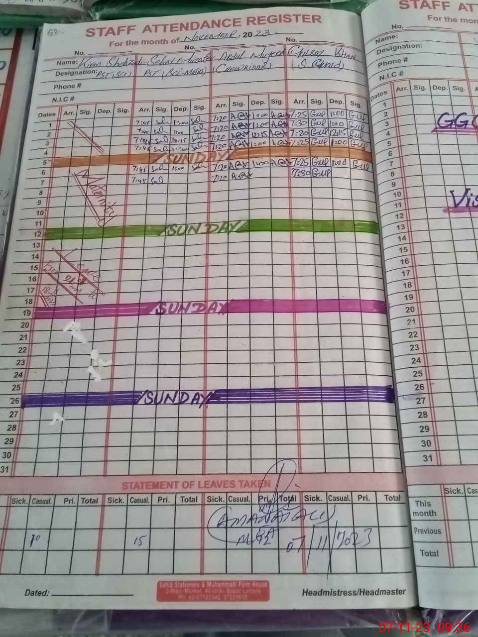 | Remarks (Use Separate Page if Required): PST science went on leave wef 21 August to 18 November 2023 with out approval of leave application her leave application on sis still pending till now So she marked an absent | |||||