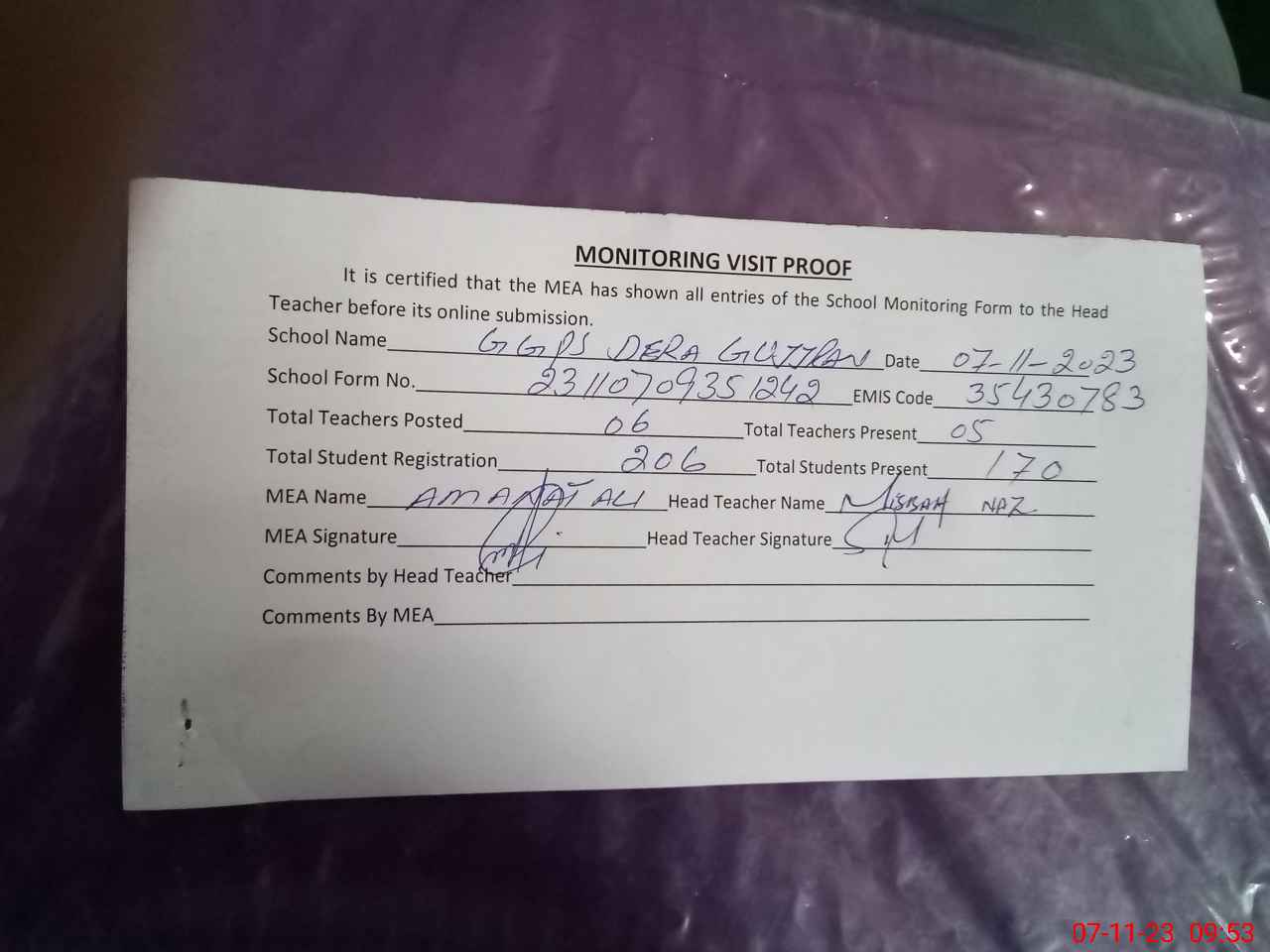 | Attendance Register | Head Teacher | MEA with School | Visit Proof |