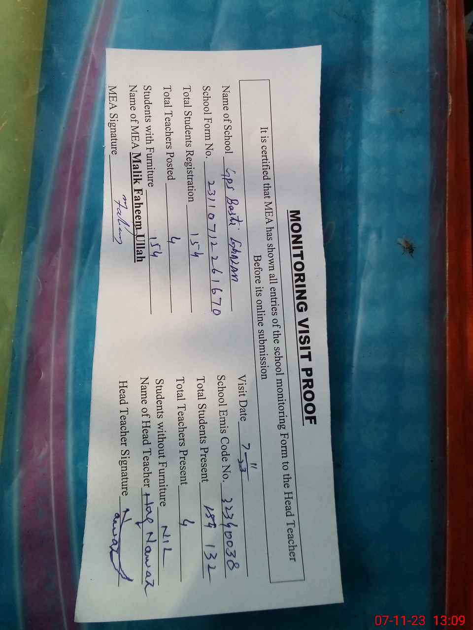 | Attendance Register | Head Teacher | MEA with School | Visit Proof |