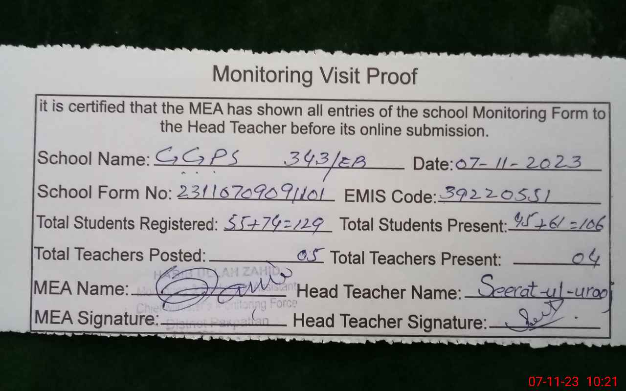 | Certified that this School was Inspected by the Undersigned MEA/DMO Today and the Information Stated Above is as Per Record. | |||||