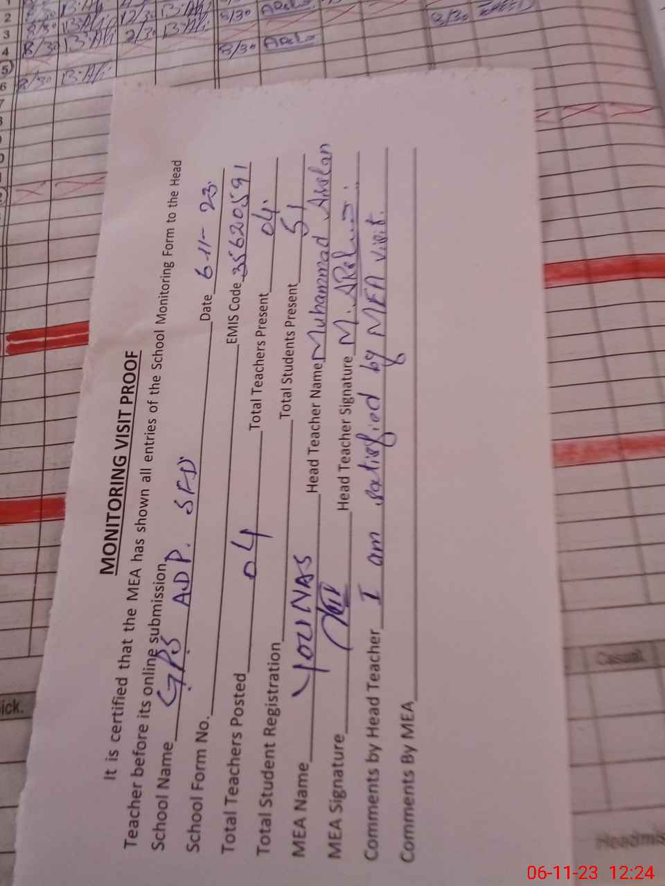 | Attendance Register | Head Teacher | MEA with School | Visit Proof |