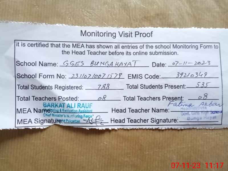 | Attendance Register | Head Teacher | MEA with School | Visit Proof |