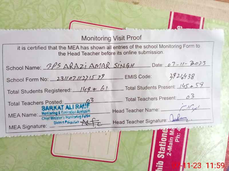 | EMIS Code: 39210438 | Name of School: GPS ARAZI AMAR SINGH | |||