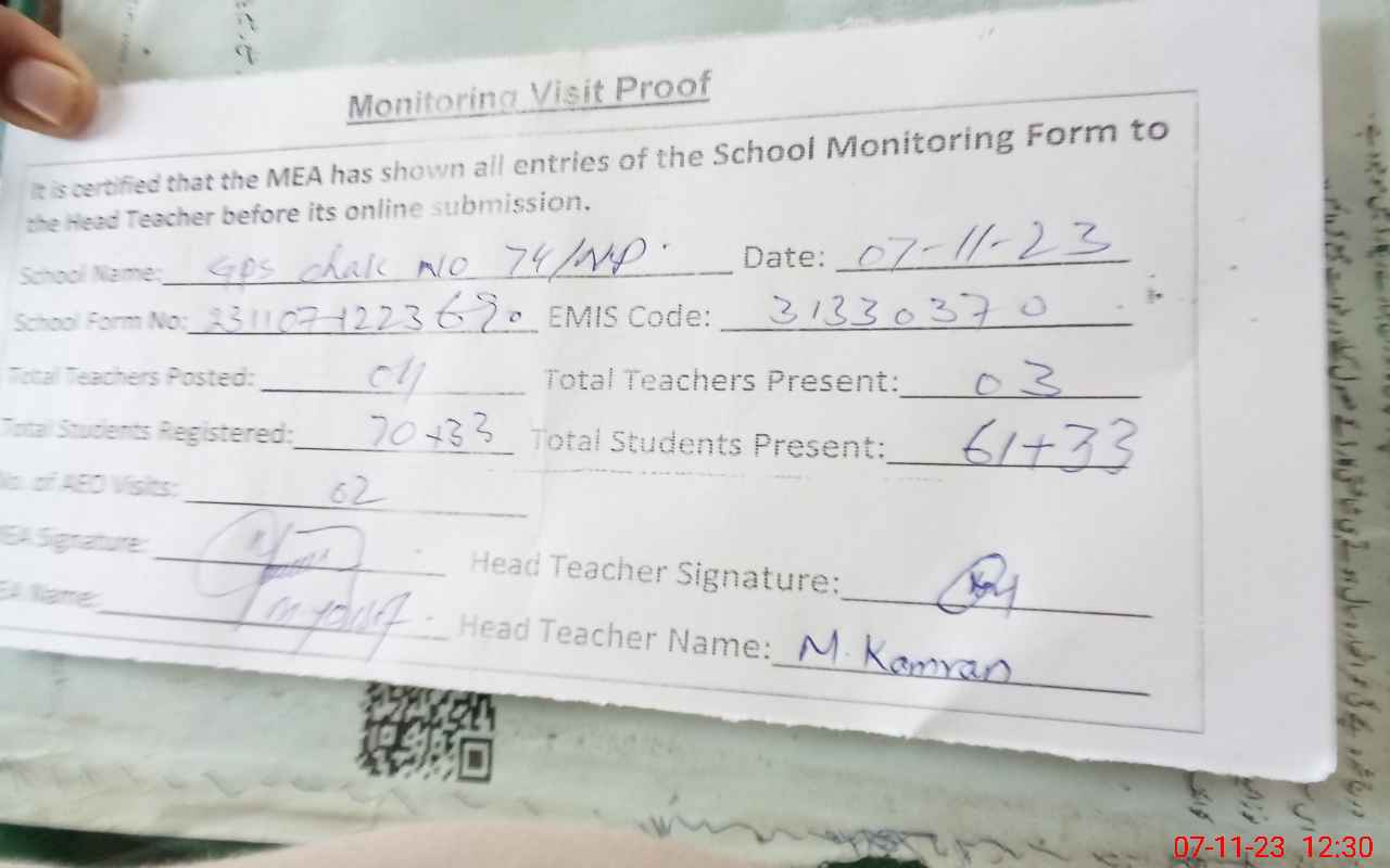 | EMIS Code: 31330370 | Name of School: GPS CHAK 74/NP | |||
