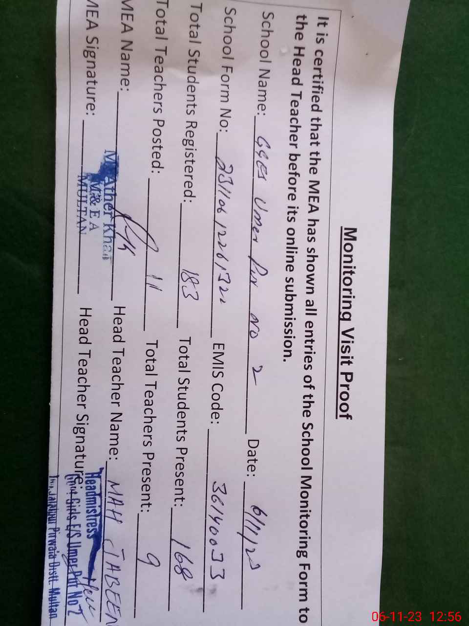 | Attendance Register | Head Teacher | MEA with School | Visit Proof |
