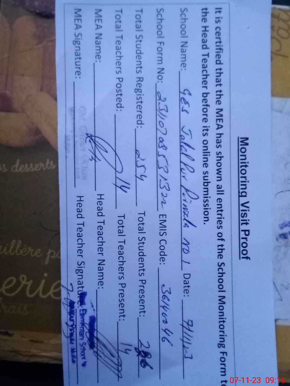 | EMIS Code: 36140046 | Name of School: GES JALAL PUR PIRWALA NO.1 WARD NO 4 | |||