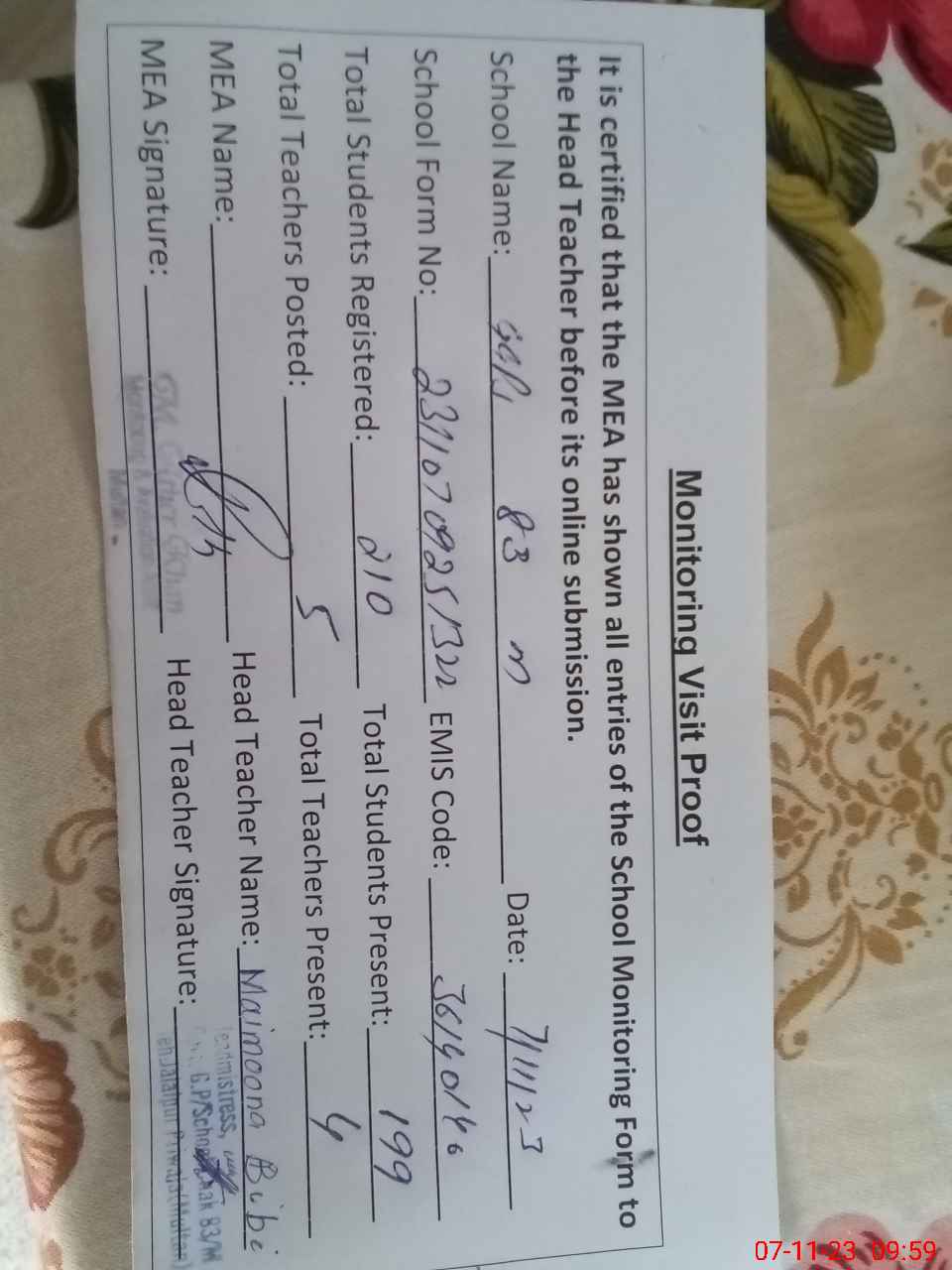| Certified that this School was Inspected by the Undersigned MEA/DMO Today and the Information Stated Above is as Per Record. | |||||
