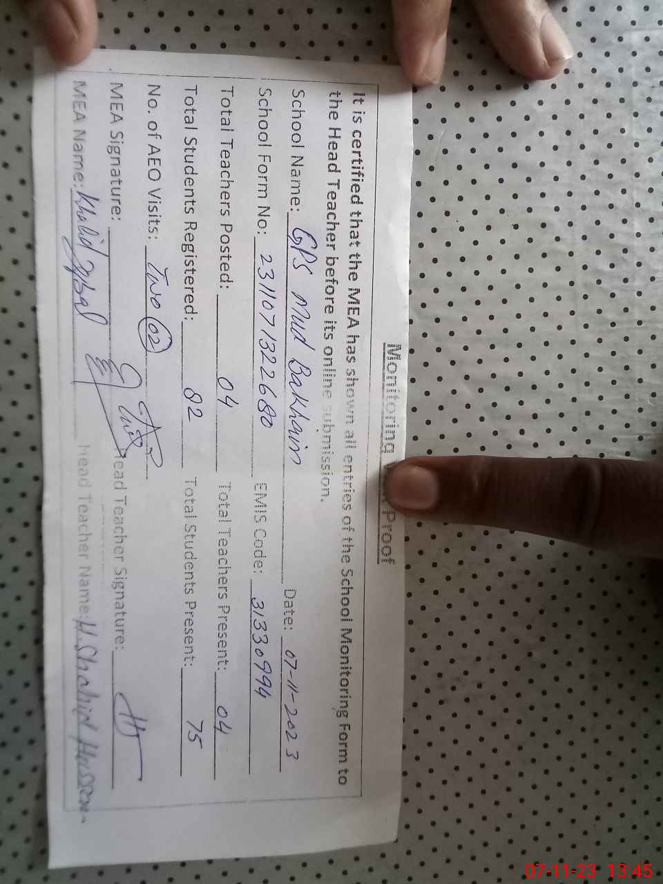 | EMIS Code: 31330994 | Name of School: GPS MUD BUKHSHAN | |||