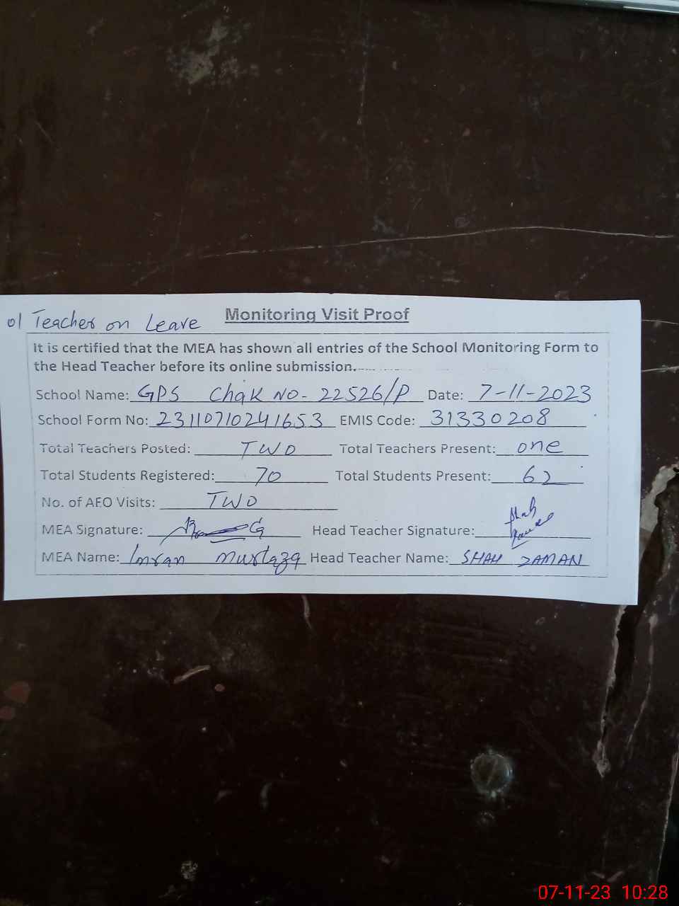 | Attendance Register | Head Teacher | MEA with School | Visit Proof |
