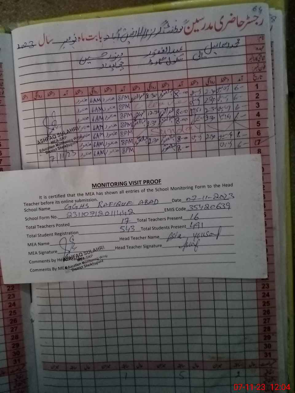 | Attendance Register | Head Teacher | MEA with School | Visit Proof |