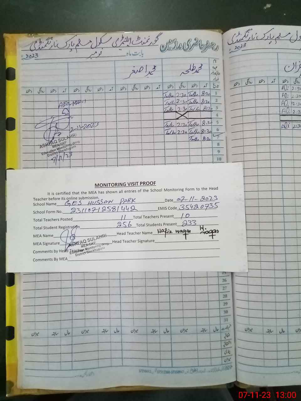 | Attendance Register | Head Teacher | MEA with School | Visit Proof |
