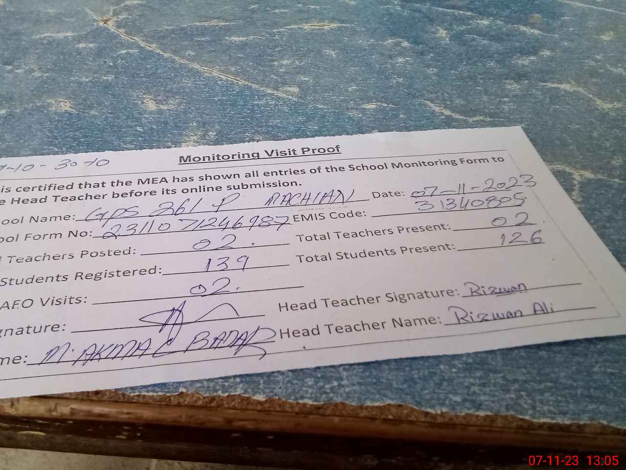 | Attendance Register | Head Teacher | MEA with School | Visit Proof |