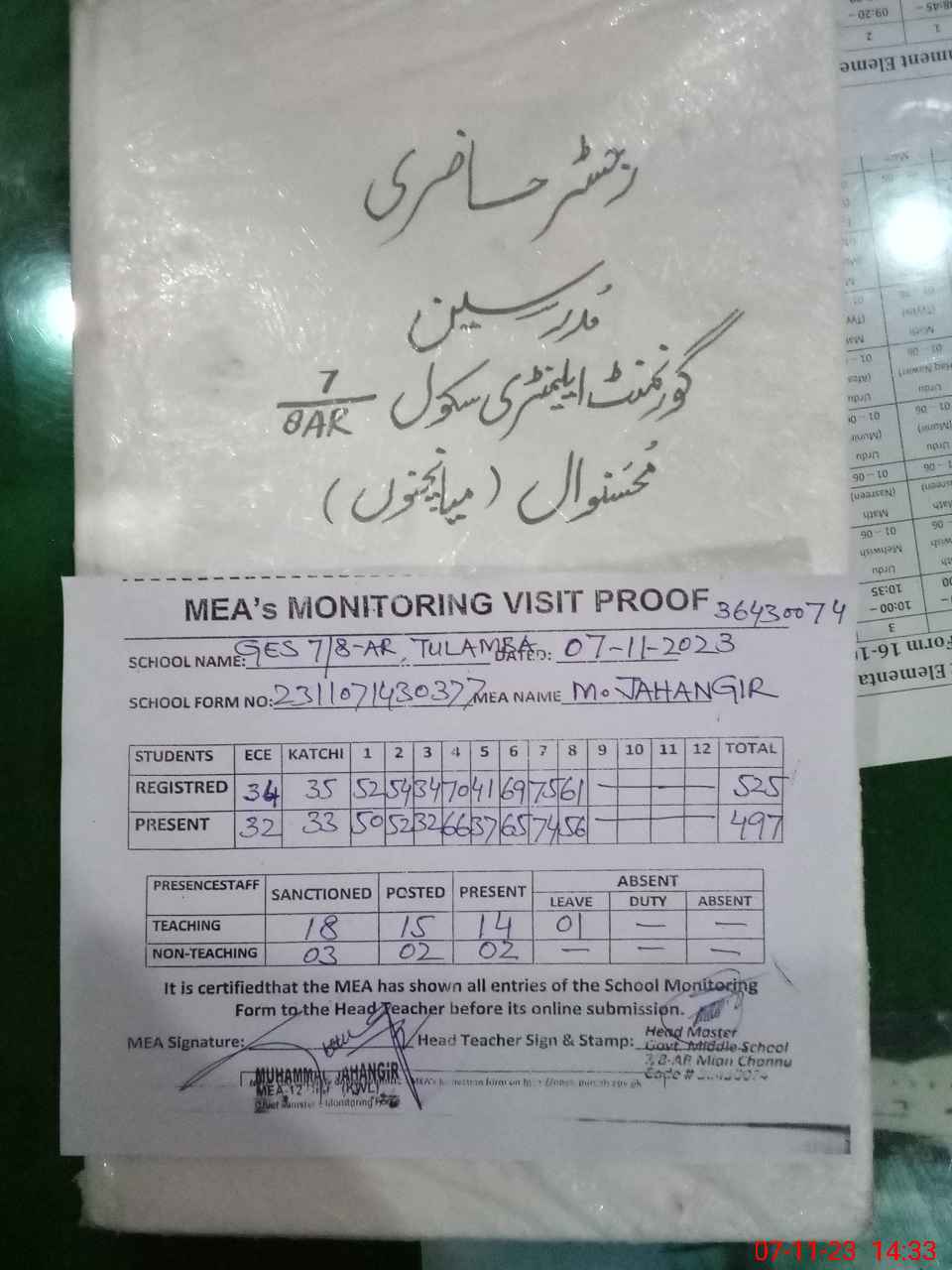 | Attendance Register | Head Teacher | MEA with School | Visit Proof |
