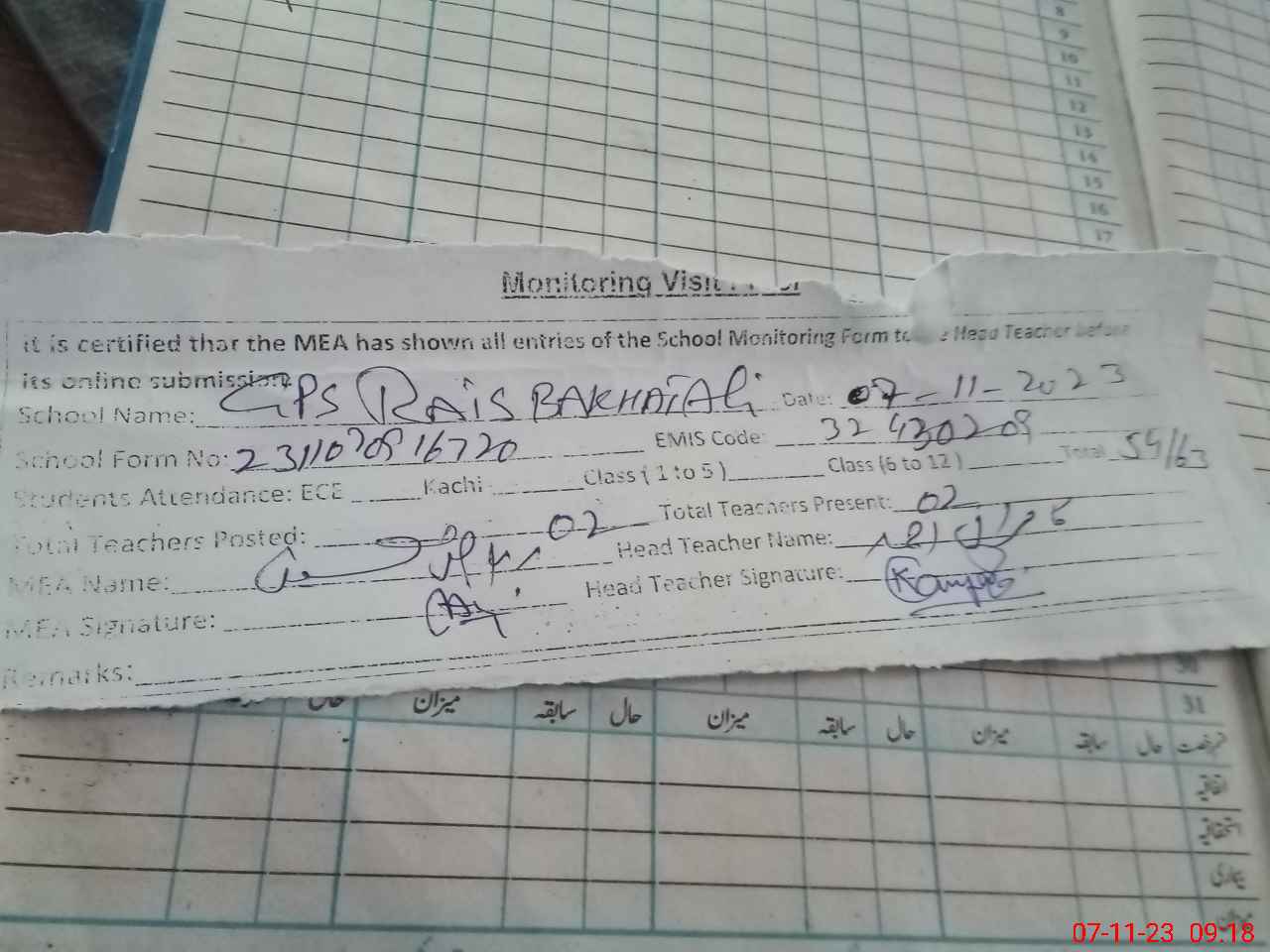 | Attendance Register | Head Teacher | MEA with School | Visit Proof |