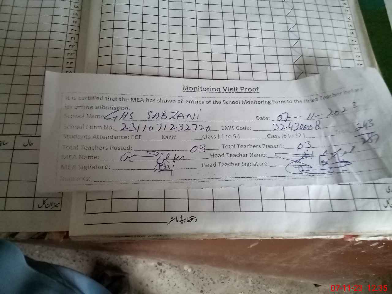 | Attendance Register | Head Teacher | MEA with School | Visit Proof |