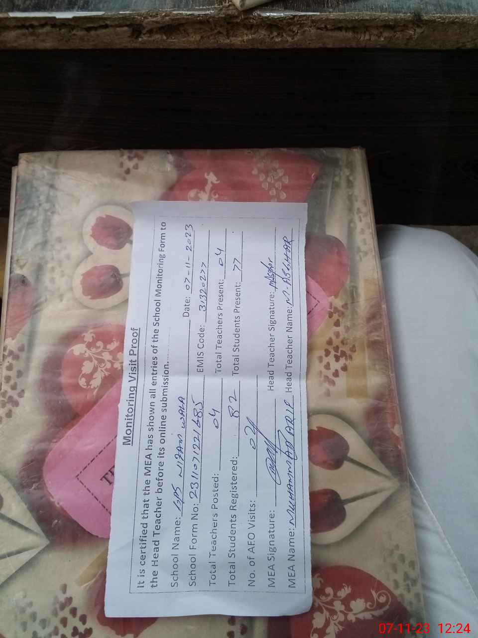 | Attendance Register | Head Teacher | MEA with School | Visit Proof |