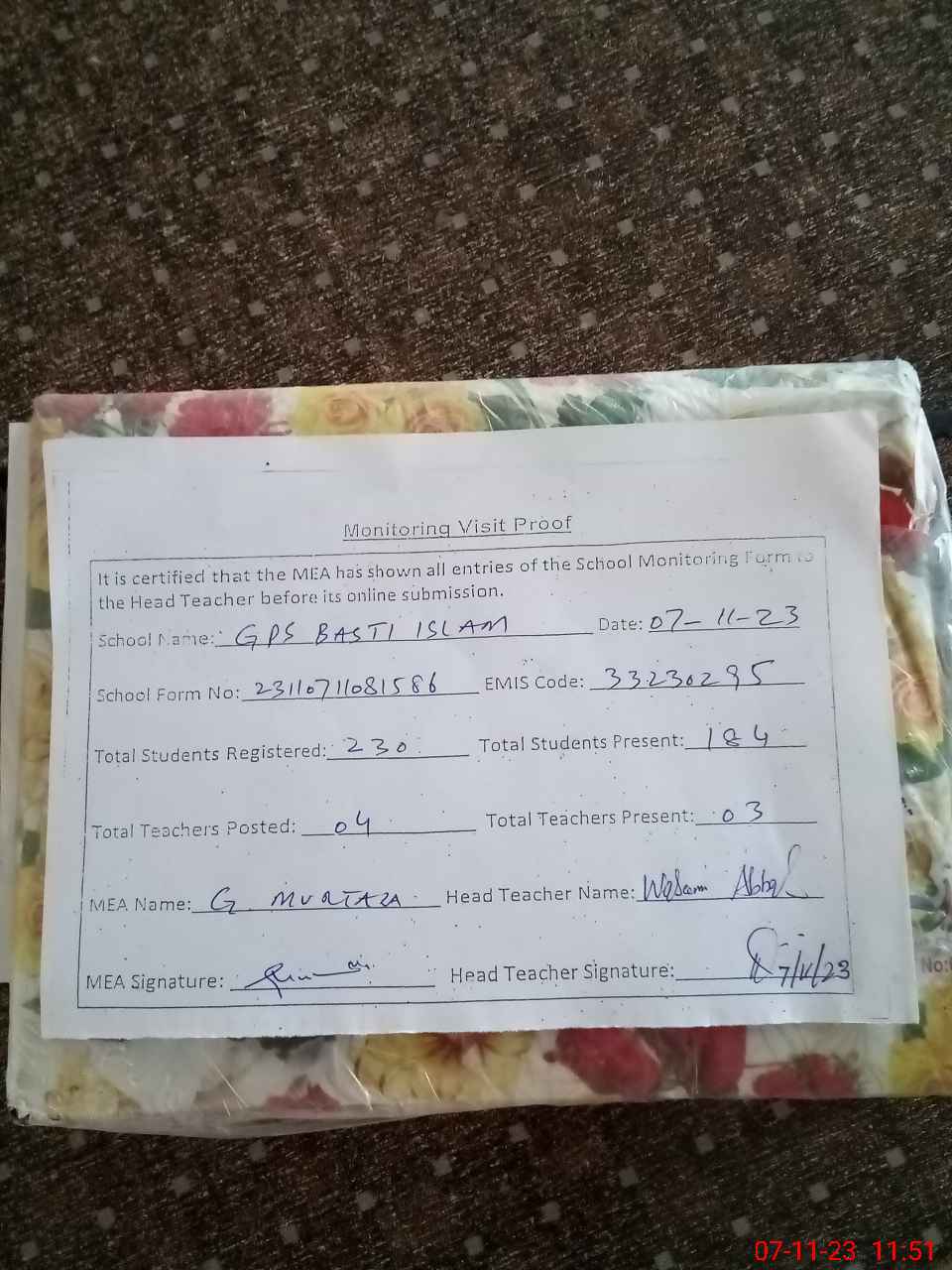 | Attendance Register | Head Teacher | MEA with School | Visit Proof |