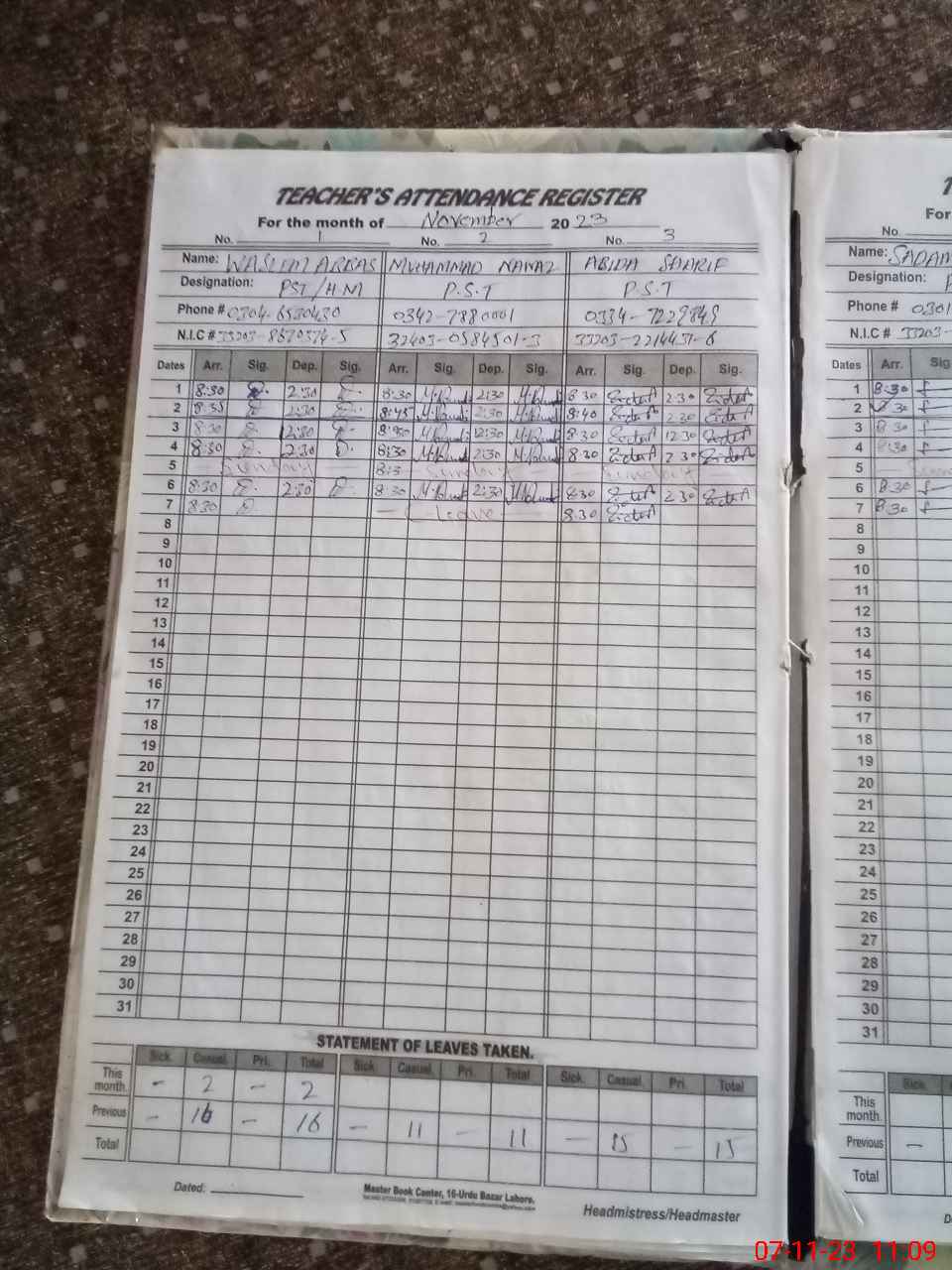 | CNIC | Full Name | Designation | R/C | Absence During Last Calender Month |