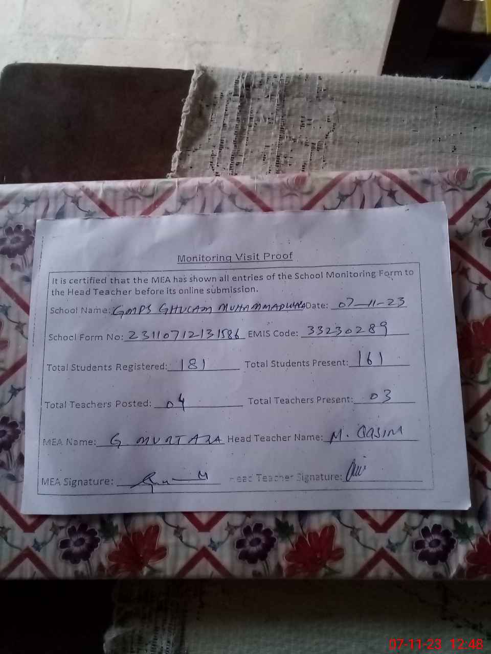 | EMIS Code: 33230289 | Name of School: GMPS GHULAM MUHAMMAD WALA | |||