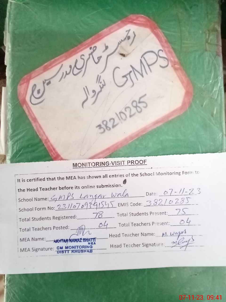 | EMIS Code: 38210285 | Name of School: GMPS LANGAR WALA | |||