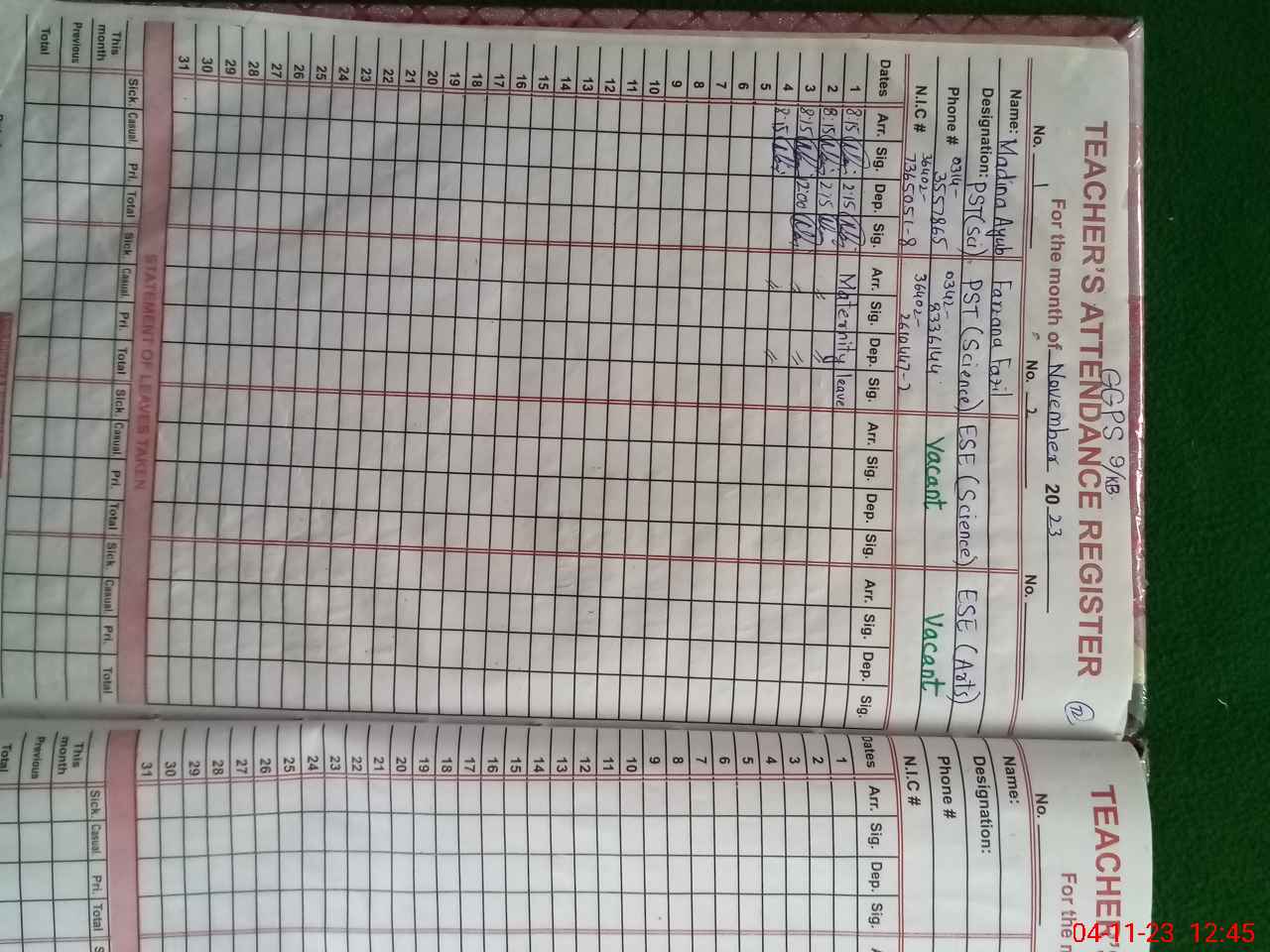 | Name: Ma**** Ay**** Designation: (School Headmaster's/Headmistress's) PST Phone/Cell Number: 03**** |