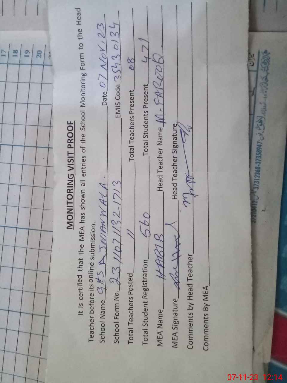 | Attendance Register | Head Teacher | MEA with School | Visit Proof |