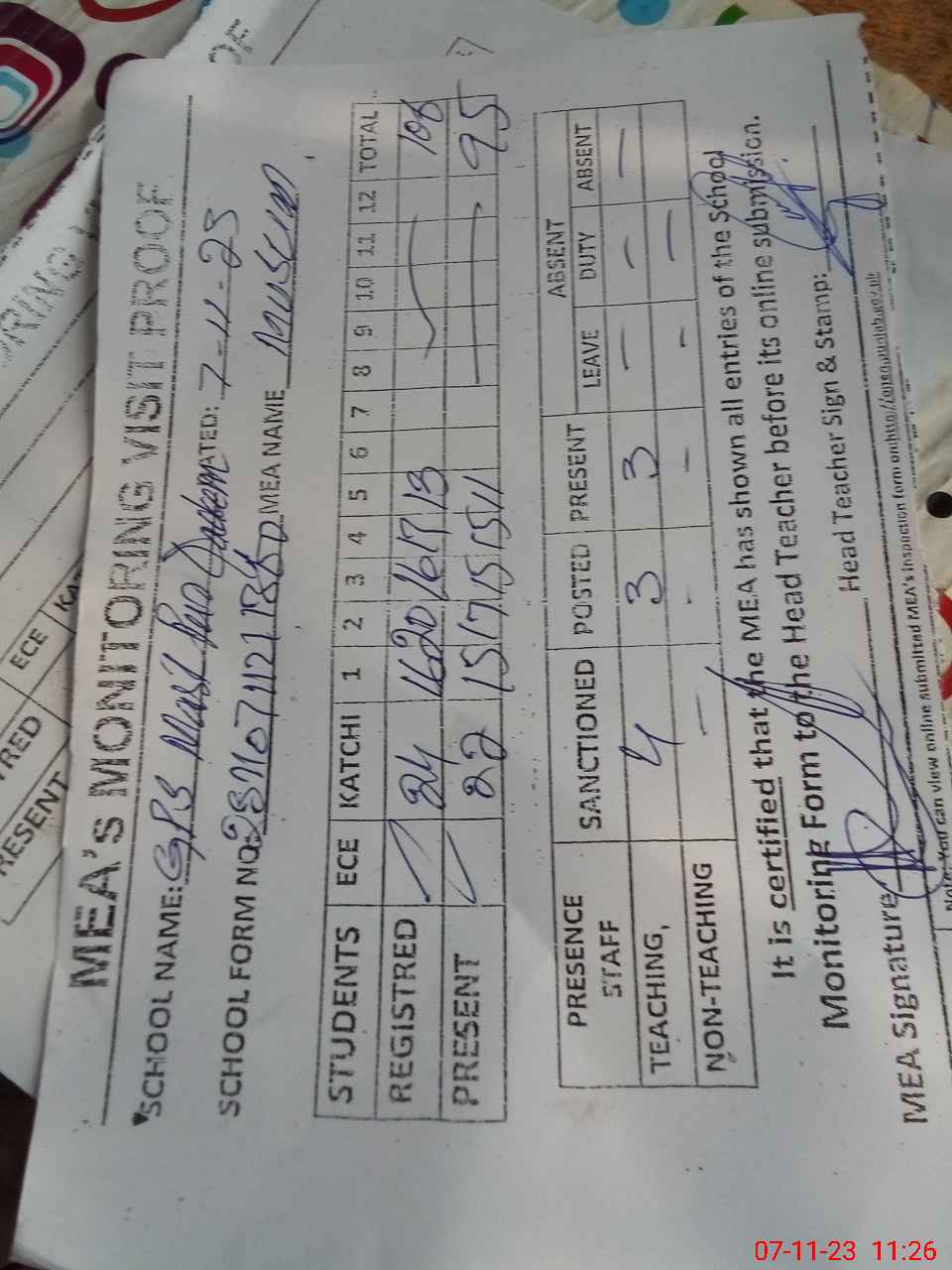 | Attendance Register | Head Teacher | MEA with School | Visit Proof |