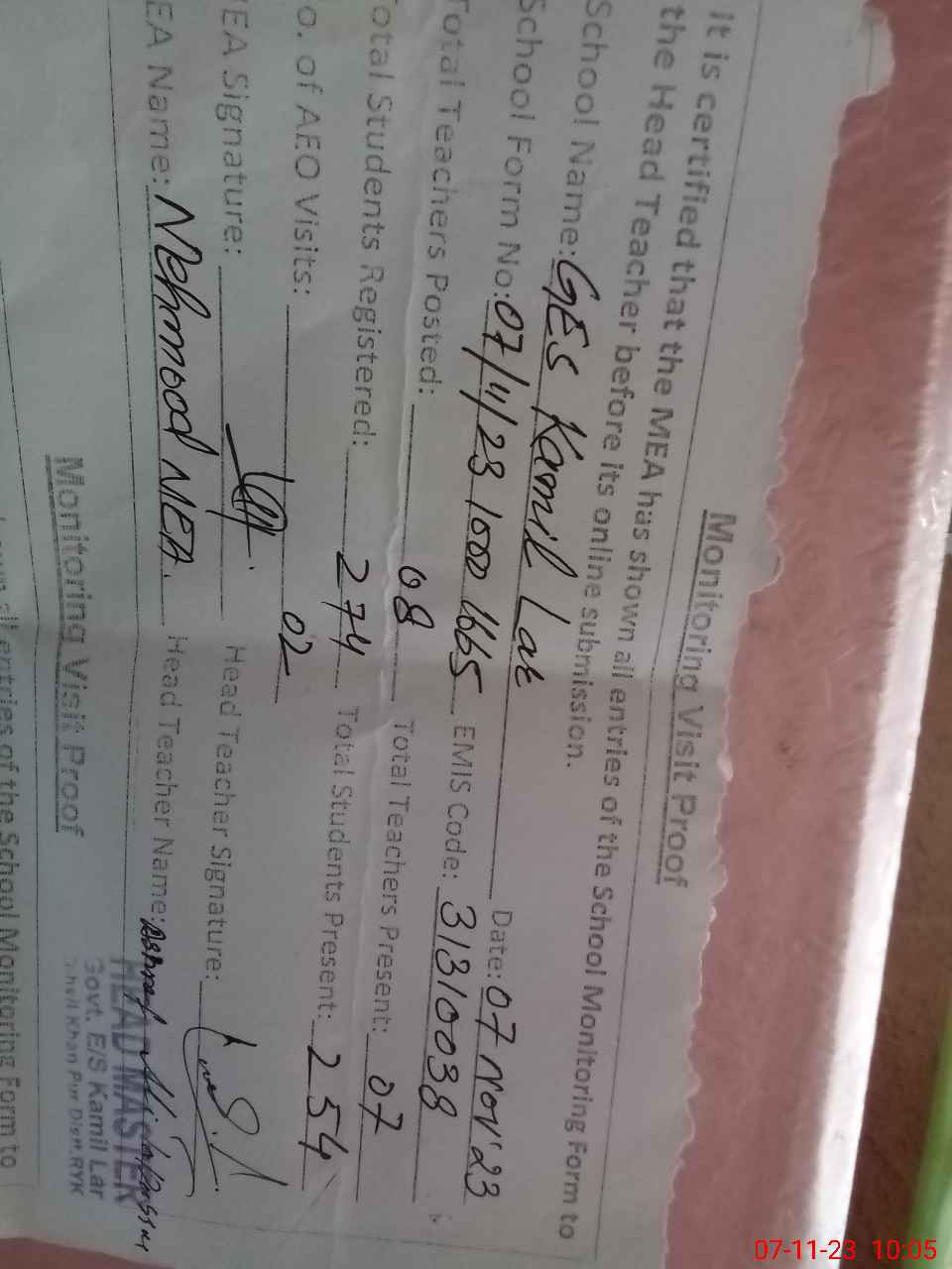 | Attendance Register | Head Teacher | MEA with School | Visit Proof |